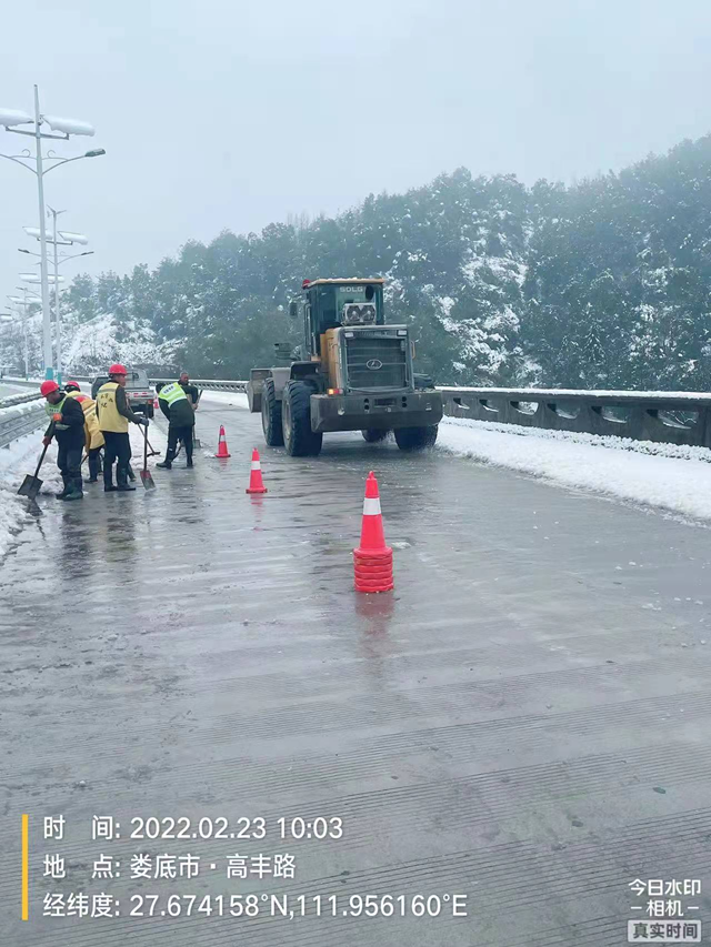 為確保轄區范圍內不發生房屋倒塌,確保道路暢通以及安置基地、在建項目、公路、企業、人民群眾生命財產安全,萬寶投資集團上下一心,日夜奮戰,全力以赴做好掃雪除冰保暢安行動。集團總經理徐業波對工作做出具體安排。集團干部職工調配機械設備和應急物資,班子成員帶隊上路巡查,堅守在各在建工地、安置基地,對婁雙公路、高豐路、早元西街、婁底城區路段主干道、孫水河4座大橋容易積雪的路段,采用“人工+機械”巡回作業除雪方式,清理積雪,拋灑工業鹽。截止23日下午,集團出動50余人次,機械設備8臺次,拋灑工業鹽18噸,清理積雪15公里,確保轄區內主干道、橋梁及時暢通,保障了群眾的出行和財產安全。