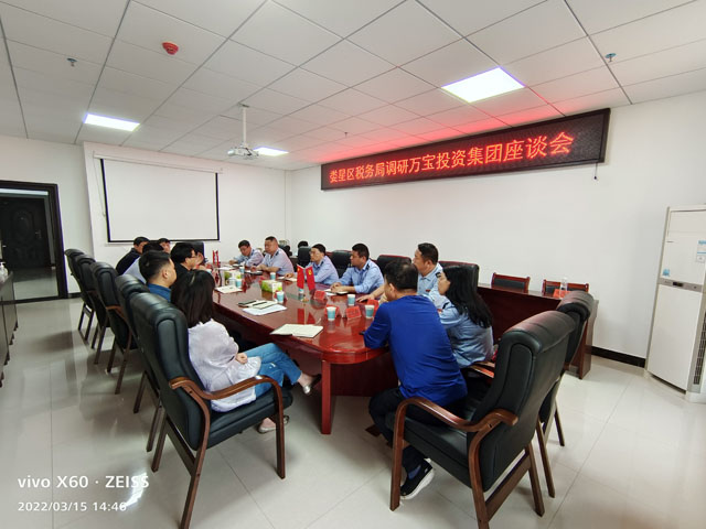 3月15日下午,婁星區稅務局局長張祖德一行來萬寶投資集團進行稅源調研并召開座談會。董事長梁養賢、總經理徐業波以及財務融資部、投資發展部、鏈城數據公司、萬廣隆公司負責人參加。