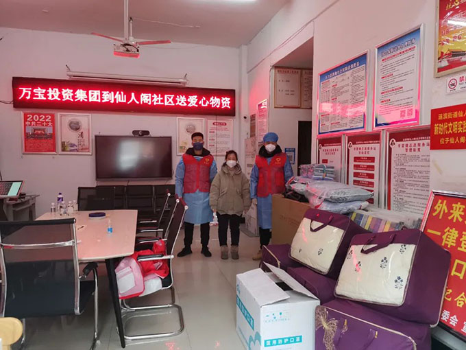 12月1日,萬寶投資集團黨員志愿者到金色桃園小區助力疫情防控工作,與社區工作人員一同維護現場秩序,并向小區居民宣傳疫情防控知識。12月3日,萬寶投資集團開展“黨員進社區、服務在基層”活動,把N95口罩、被褥、枕頭和折疊床等一批愛心防疫物資送到仙人閣社區,為社區疫情防控工作開展提供了有力的物資保障,也為在嚴寒中堅守的一線工作人員送去了關懷和溫暖。