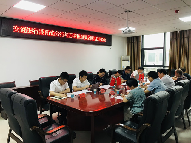 8月26日上午,交通銀行湖南省分行投行部副總經理賀曉玢一行,在交通銀行婁底分行副行長邢英等陪同下,來萬寶投資集團開展項目對接。萬寶投資集團董事長梁養賢、總經理徐業波及財務融資部負責人參與接洽并組織召開座談會,雙方就我司近期即將發行的短期融資券項目進行了深入的溝通交流。